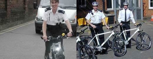 (26.02.03/mm) Ob die neue Maut für Londons Innenstadt daran Schuld ist? Londons Polizei schwingt sich in den Sattel von Cesur Bikes - mit montiertem Warnlicht.